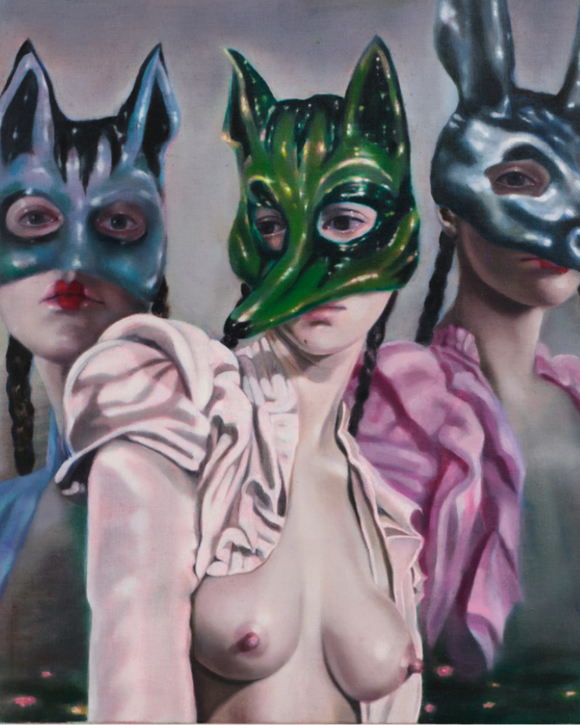 “Peter and the Wolf” takes its name from the symphonic folk tale written by Sergei Pokofiev in 1936 in which Peter and his animal friend, each represented by an instrument in the orchestra, capture a wolf despite being warned against playing in the meadow alone. Lennox is unafraid to paint and excavate ancestral tales, unearthing horror chests which may have been hidden, those which cross psychological and physical boundaries to expose internal depths. Through her use of natural openings, volcanos, shells, and here masks, these guises for transformation also become portals for traversing and collapsing the borders between reality and fantasy, the beautiful and grotesque, dissolving into something much more enchanting.